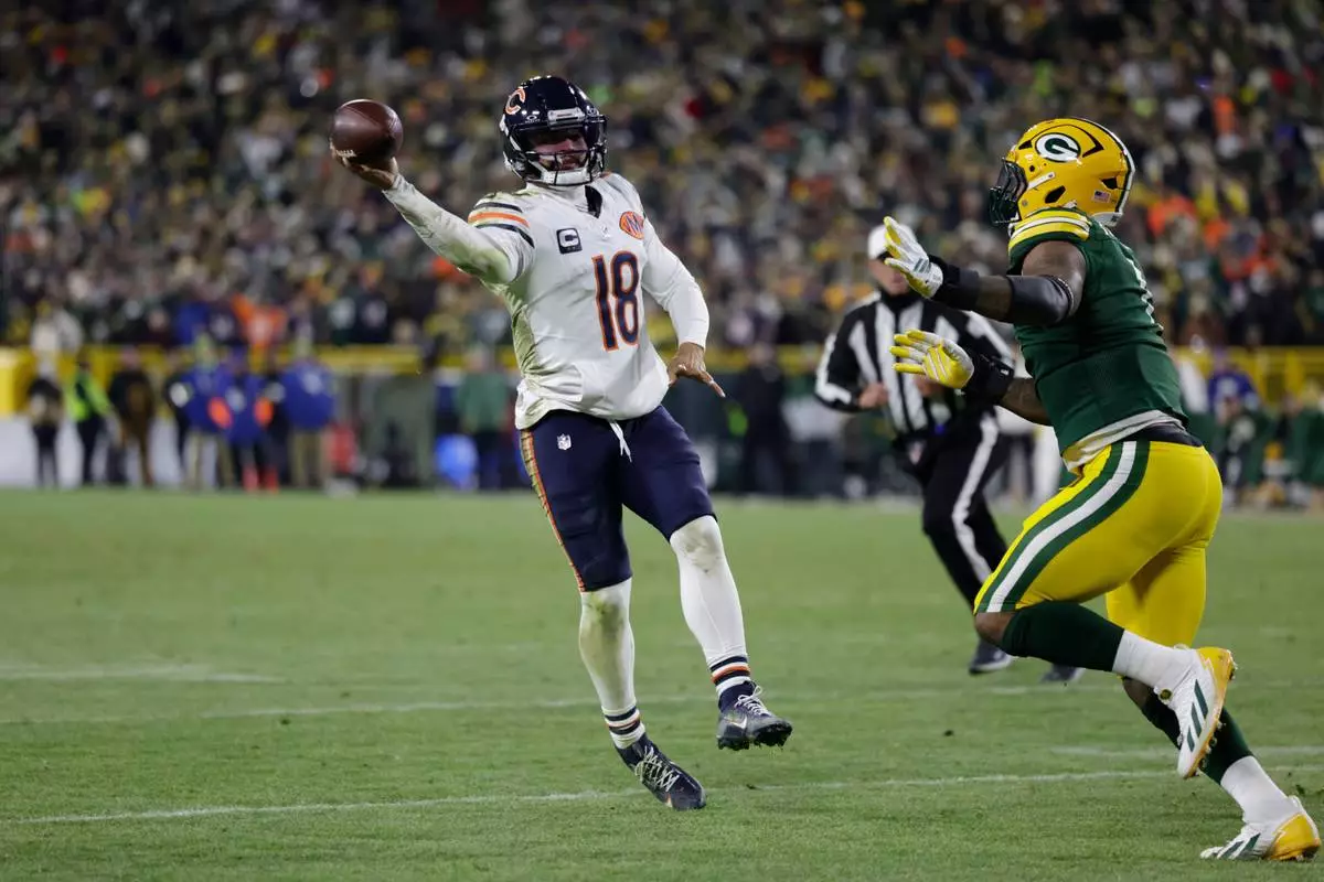 Chicago Bears quarterback Caleb Williams (18) throws a pass for a touchdown against Green Bay Packers defensive end Micah Parsons, right, during the second half of an NFL football game Sunday, Dec. 7, 2025, in Green Bay, Wis. (AP Photo/Matt Ludtke)