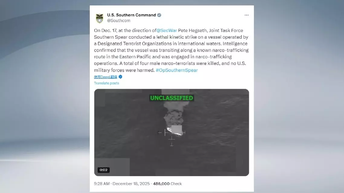 The vessel was operated by Designated Terrorist Organizations and U.S. intelligence confirmed that it was transiting along known narco-trafficking routes in the Eastern Pacific and was engaged in narco-trafficking operations, said the command in a post on X.