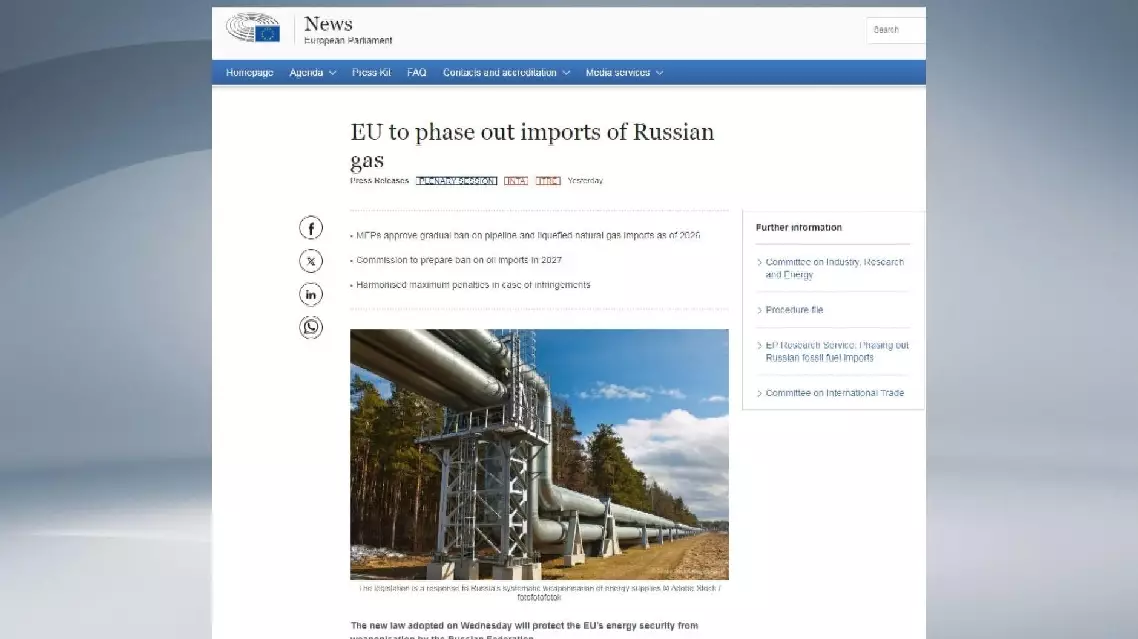 The European Parliament on Wednesday approved a legislation to ban spot-market imports of Russian liquefied natural gas (LNG) once the regulation enters into force in early 2026, while imports of Russian pipeline gas will be phased out by September 30, 2027.