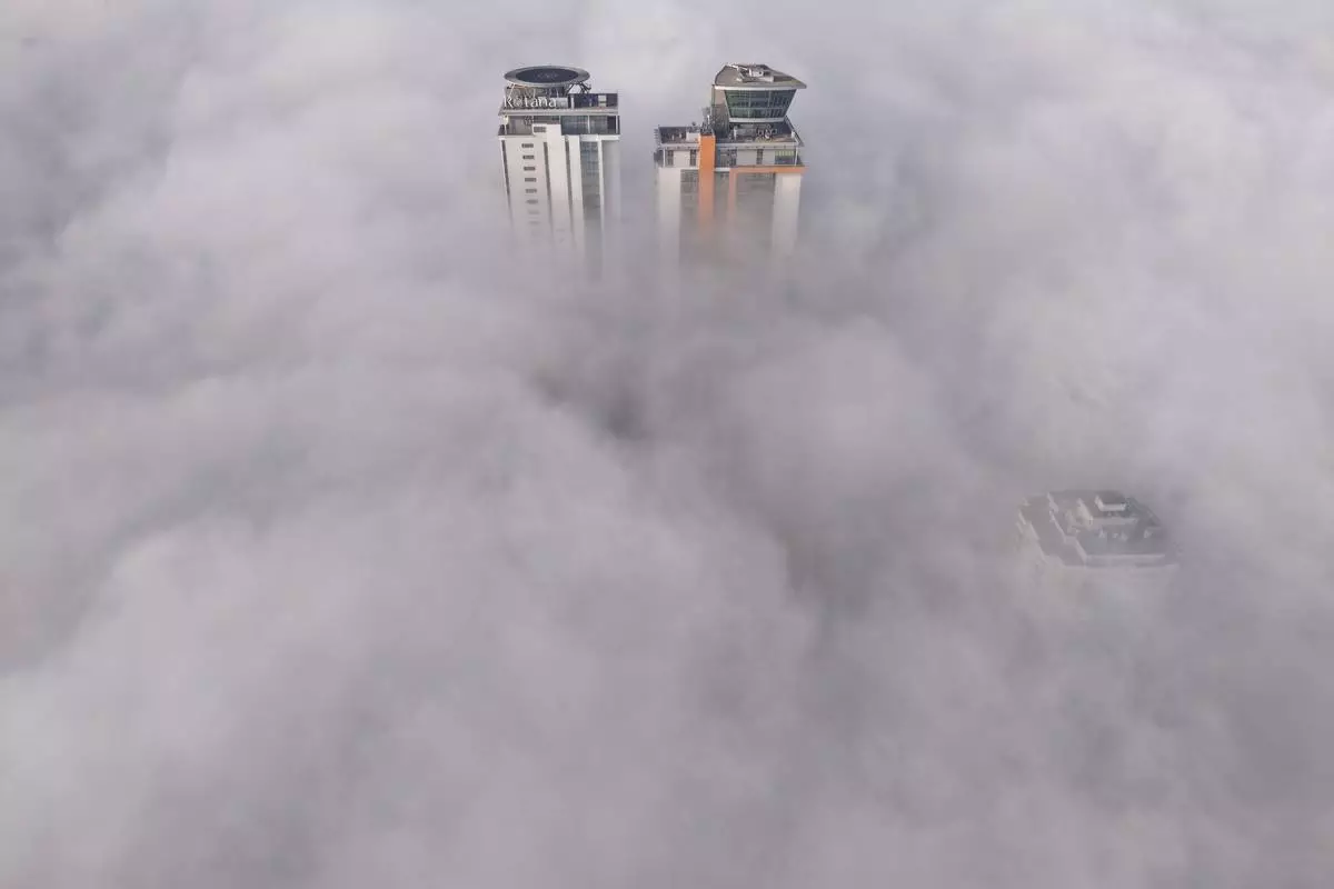 An aerial view of buildings peaking through a dense layer of fog in Sarajevo, Bosnia, Thursday, Dec. 18, 2025. (AP Photo/Armin Durgut)