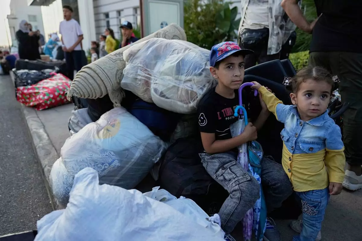 FILE - Syrian children sit next to their belongings at a gathering point, as they wait to be checked by Lebanese security forces before boarding buses to return home to Syria, in Beirut, Lebanon, Thursday, Sept. 11, 2025. (AP Photo/Hussein Malla, File)