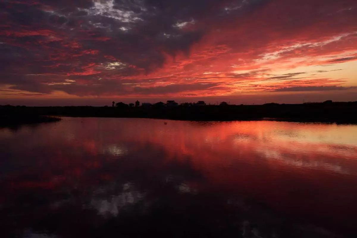 Clouds illuminated by the setting sun are reflected in water at the Wolfberry Whooping Crane Sanctuary, Friday, Dec. 12, 2025, near Seadrift, Texas. (AP Photo/John Locher)