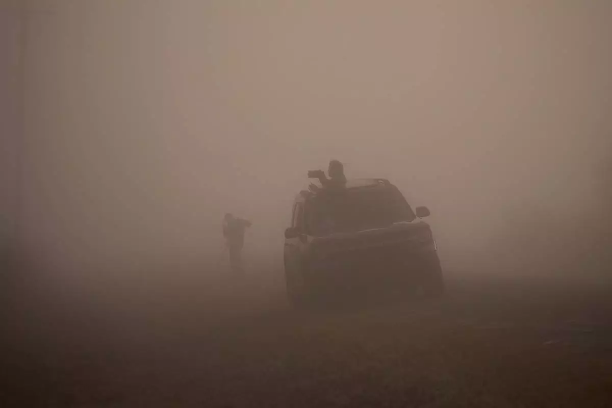 People wait for fog to clear while trying to photograph whooping cranes, Friday, Dec. 12, 2025, in Rockport, Texas. (AP Photo/John Locher)