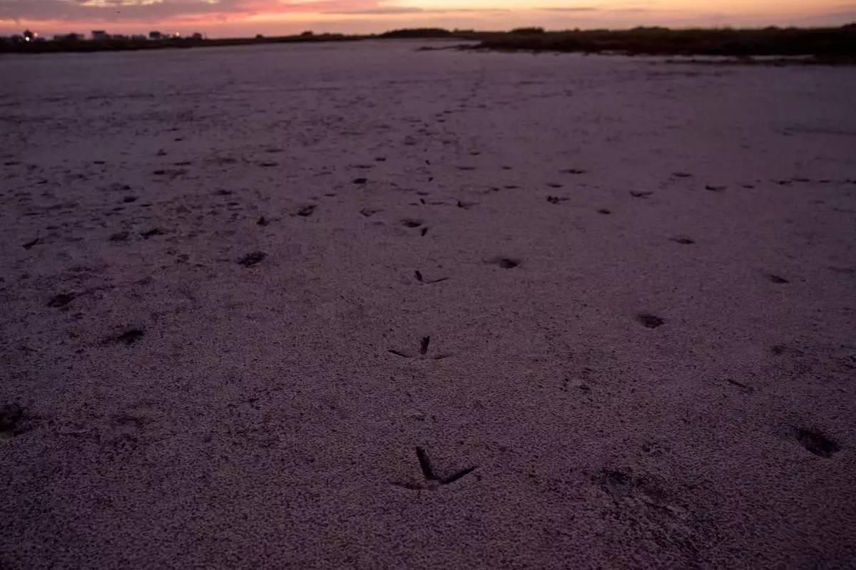 Crane tracks are visible at the Wolfberry Whooping Crane Sanctuary, Friday, Dec. 12, 2025, near Seadrift, Texas. (AP Photo/John Locher)