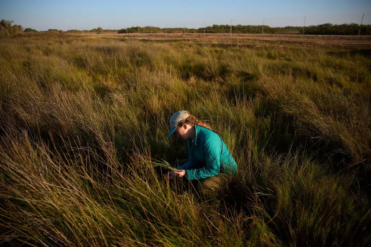 Katie Fernald, Wetland/Rangeland Ecologist, International Crane Foundation, gathers plants at the Wolfberry Whooping Crane Sanctuary, Thursday, Dec. 11, 2025, near Seadrift, Texas. (AP Photo/John Locher)