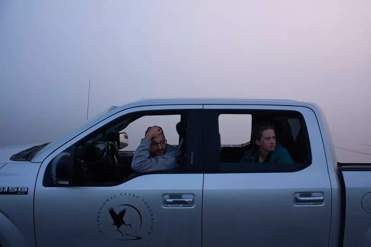 Carter Crouch, Director of Gulf Coast Programs at the International Crane Foundation, left, and Katie Fernald, Wetland/Rangeland Ecologist, International Crane Foundation, wait for fog to clear before launching a boat for whooping crane research, Friday, Dec. 12, 2025, in Rockport, Texas. (AP Photo/John Locher)