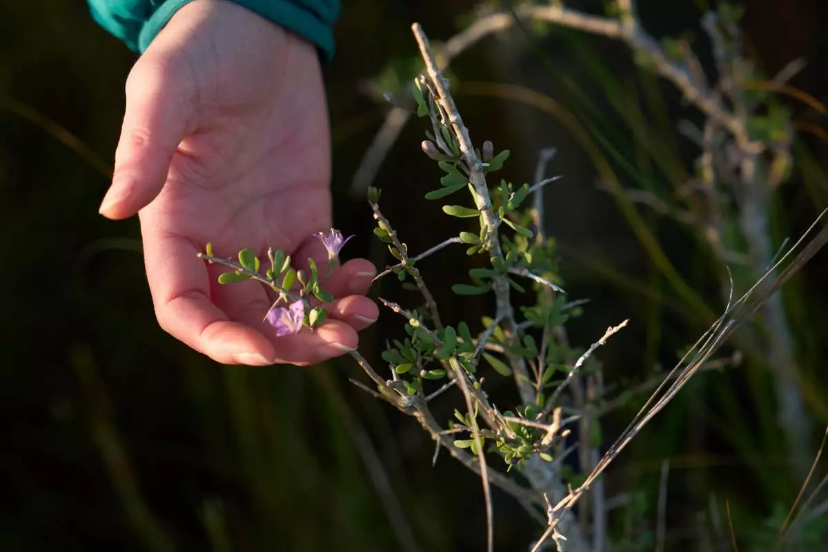 Katie Fernald, Wetland/Rangeland Ecologist, International Crane Foundation, holds a Carolina Wolfberry at the Wolfberry Whooping Crane Sanctuary, Thursday, Dec. 11, 2025, near Seadrift, Texas. (AP Photo/John Locher)