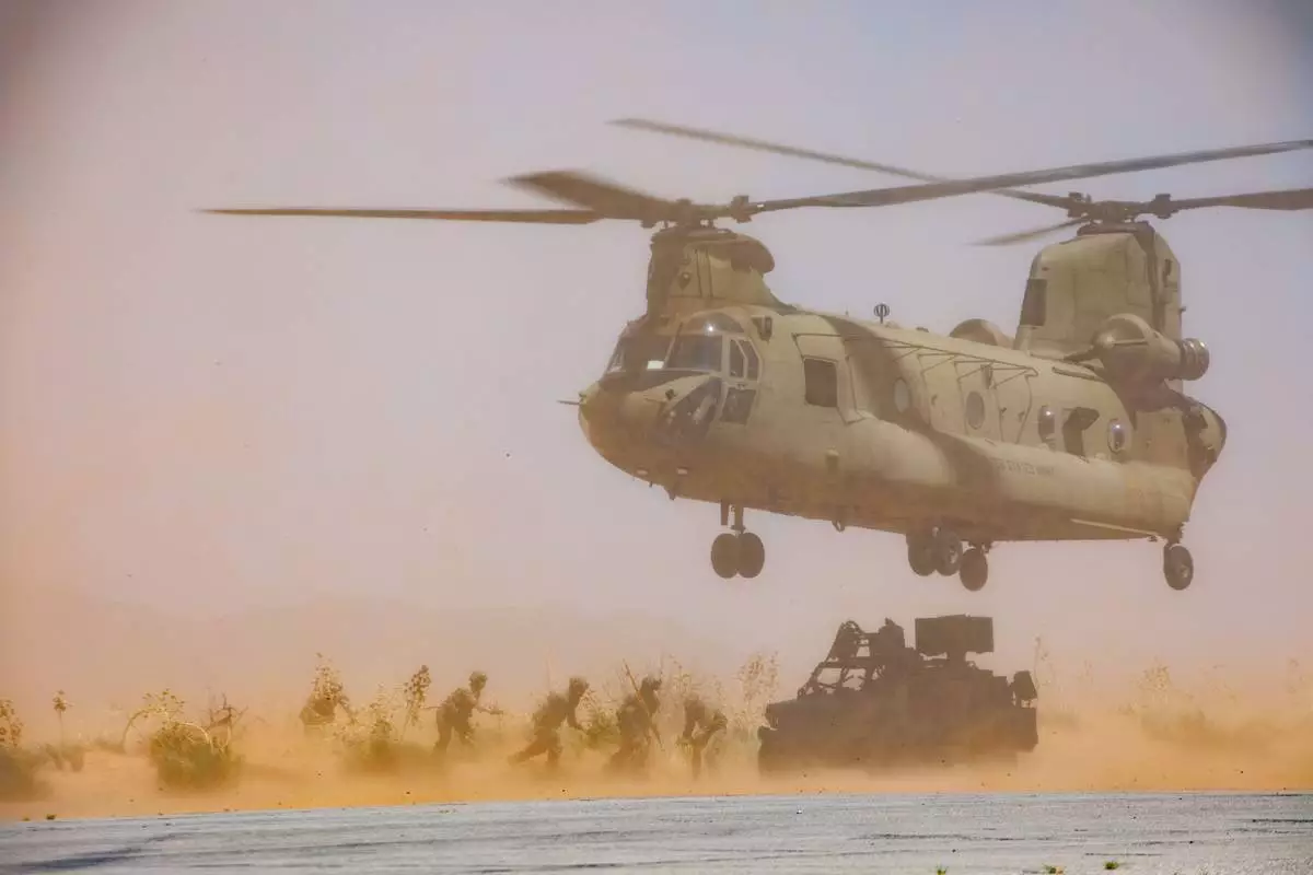U.S. Soldiers, assigned to Joint Task Force Southern Border, prepare to sling load AV’s LOCUST Laser Weapon System integrated on an Infantry Squad Vehicle to a CH-47 Chinook at Fort Bliss, Texas, July 16, 2025. JTF-SB executes full scale, agile, and all-domain operations in support of U.S. Customs and Border Protection to protect the territorial integrity of the United States and achieve 100% operational control of the southern border. [Credit: U.S. Army photo by Staff Sgt. Rynishia Lewis]