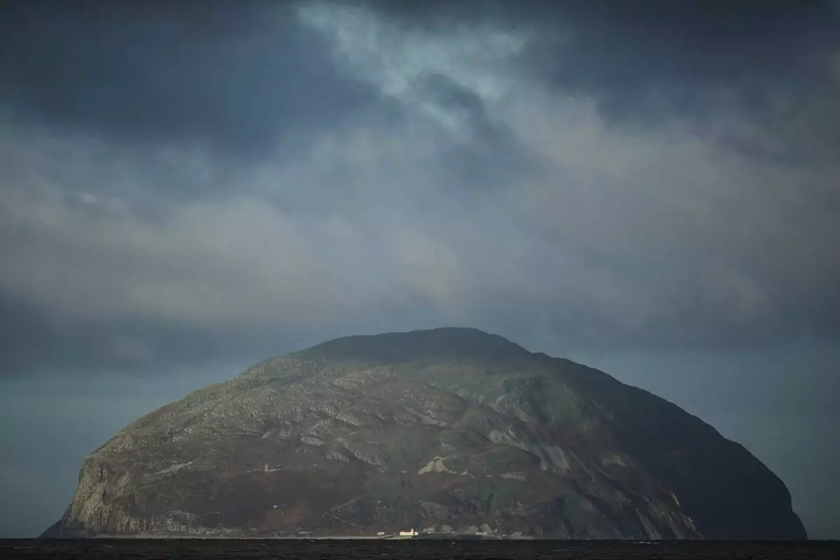The island of Ailsa Craig, where the two types of granite, Common Green and Blue Hone, that are used to make curling stones is quarried from, is seen from the beach at Girvan, Scotland, Thursday, Nov. 13, 2025. (AP Photo/Alastair Grant)