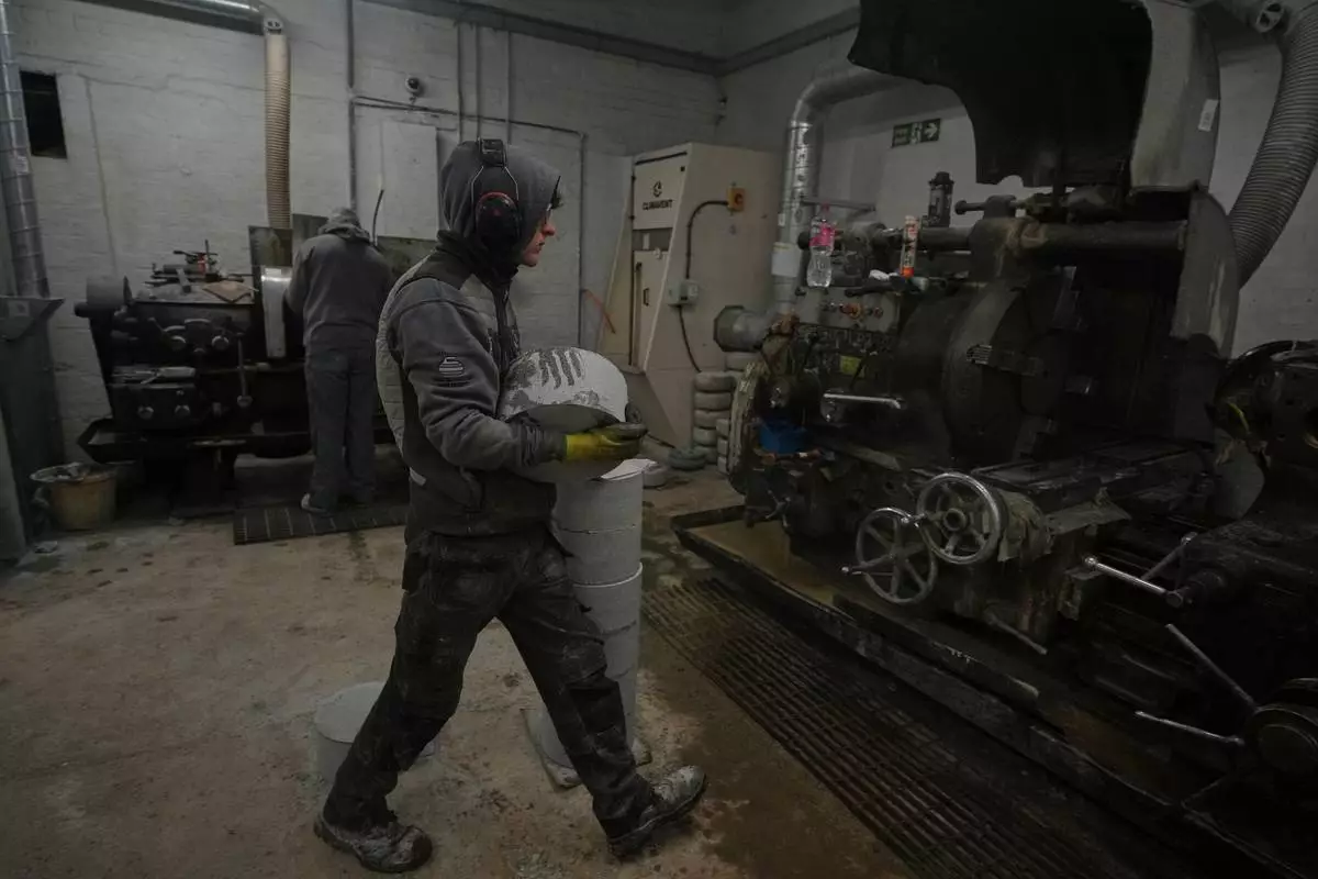 A craftsman carries a Common Green granite block to be machined into a curling stone at Kays Curling stone factory in Mauchline, Scotland, Tuesday, Nov. 11, 2025. (AP Photo/Alastair Grant)