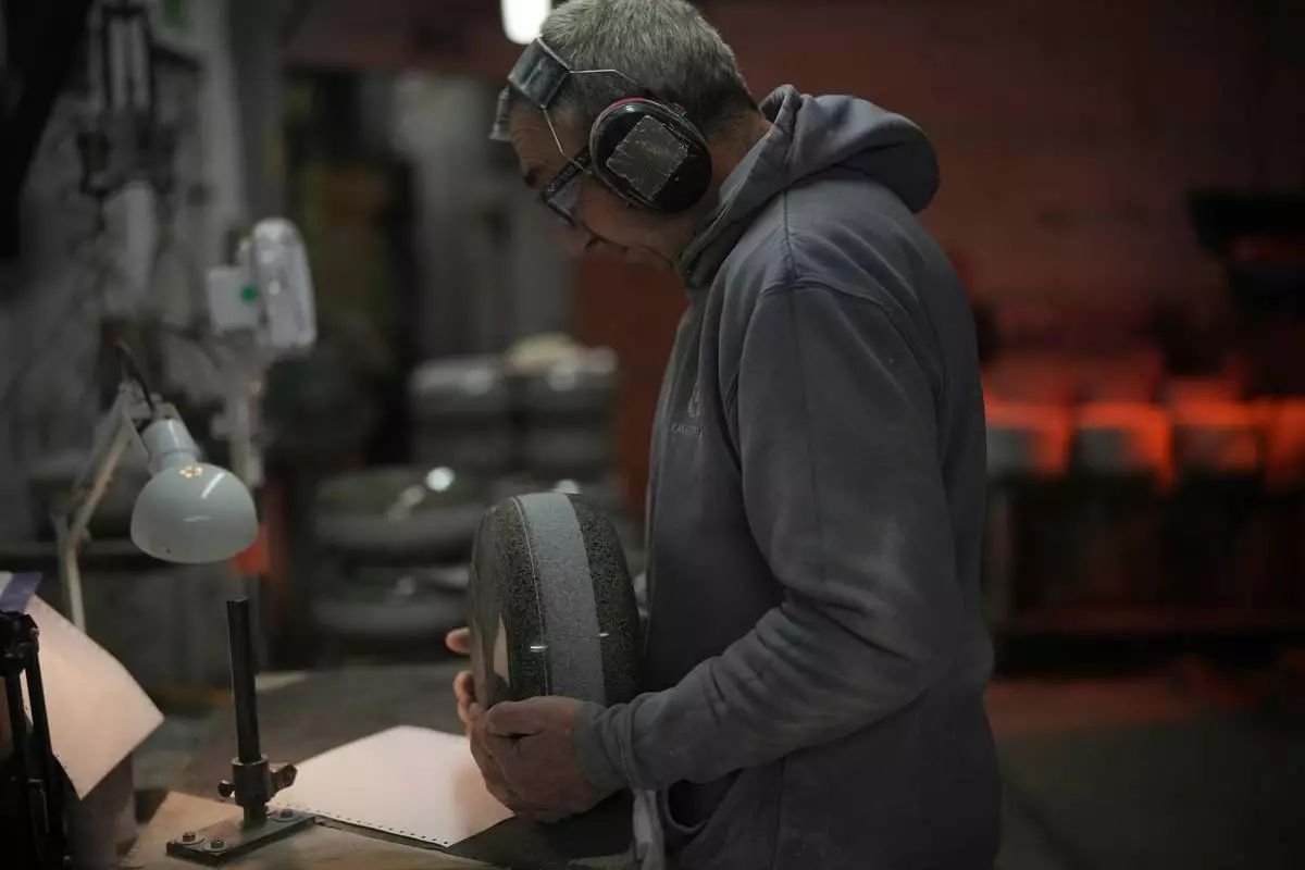 A craftsman checks a curling stone during a quality control phase at Kays Curling stone factory in Mauchline, Scotland, Tuesday, Nov. 11, 2025. (AP Photo/Alastair Grant,
