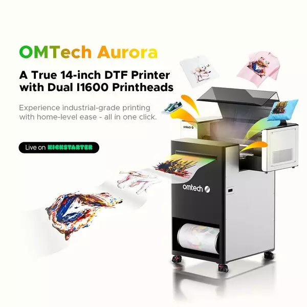 ANAHEIM, Calif., Dec. 18, 2025 /PRNewswire/ -- OMTech, industry leaders in machine technology, has announced the Kickstarter launch of the Aurora, a true 14-inch direct-to-film (DTF) printer designed to help makers and small businesses produce vibrant, durable transfers faster without the oversized footprint, need for constant monitoring, and inefficient workflows that hold many DTF setups back. Built around dual Epson I1600 industrial print heads, the Aurora pairs high throughput with ease of use, turning what's often a multi-machine process into a streamlined do-it-all production system for makers and custom apparel shops. The OMTech Aurora is available now, with deals and discounts for early adopters. Learn more here.
