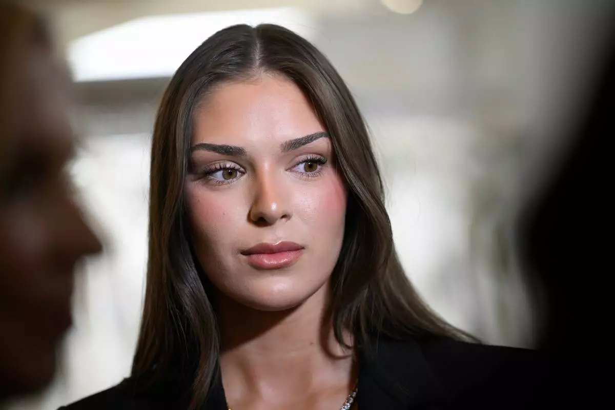 FILE - Former Miss Finland Sarah Dzafce attends a press conference in Helsinki, Finland, Thursday Dec 11, 2025. (Emmi Korhonen/Lehtikuva via AP, File)