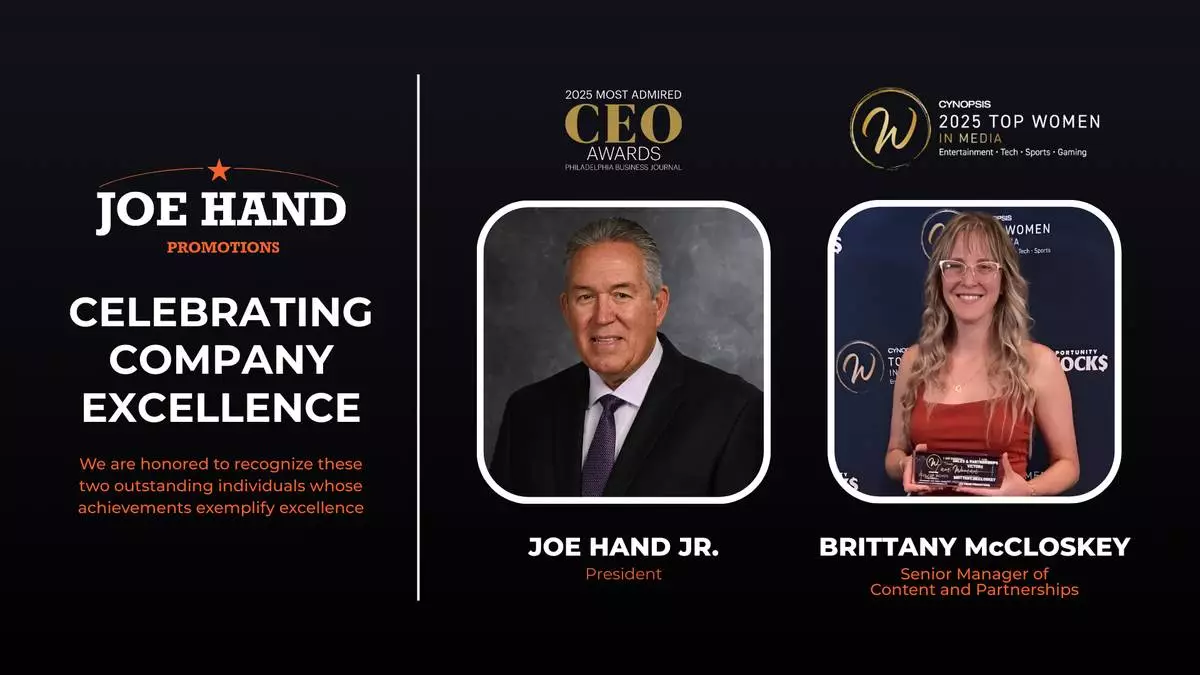 Last week, Joe Hand Jr., President of Joe Hand Promotions, was named one of the Philadelphia Business Journal’s 2025 Most Admired CEOs, honoring his visionary leadership and the sustained growth of the company. Additionally, Brittany McCloskey, Senior Manager of Content & Partnerships, was celebrated in New York City in October as a 2025 Cynopsis Top Women in Media Award honoree in the category of Sales & Partnerships Victors.