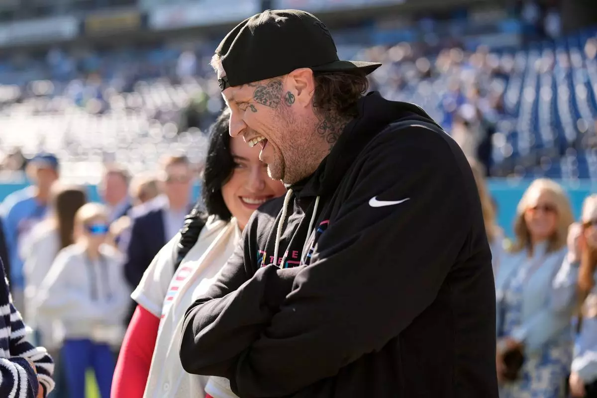 FILE - Entertainer Jelly Roll talks on the sidelines before an NFL football game between the Titans and the Seattle Seahawks, Nov. 23, 2025, in Nashville, Tenn. (AP Photo/George Walker IV, File)