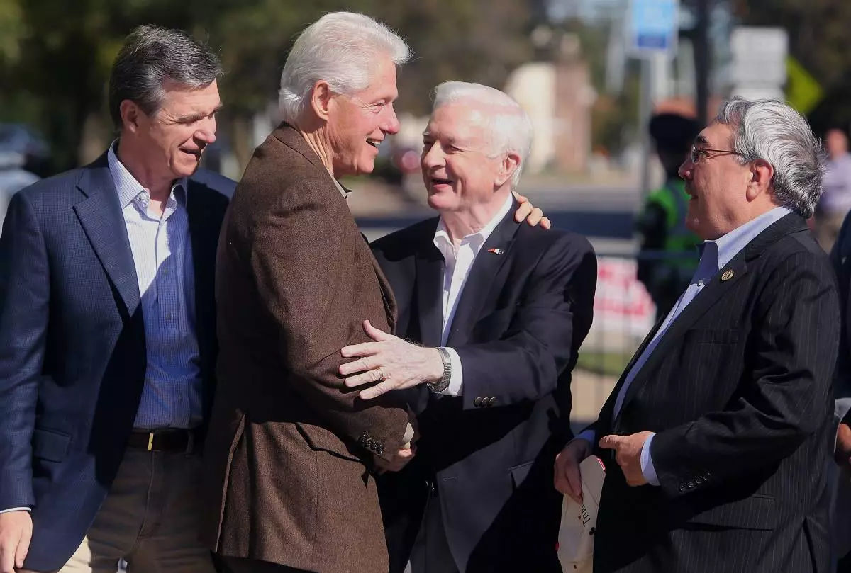 FILE - Former President Bill Clinton, second left, greets former North Carolina Gov. Jim Hunt, second right, U.S. Rep. G.K. Butterfield, D-1st District, right, and North Carolina Attorney General Roy Cooper, during a rally Oct. 25, 2016, while campaigning for Democratic presidental nominee Hillary Clinton at the N.C. Democratic Party Coordinated Campaign Office in Rocky Mount, N.C. (Alan Campbell/The Rocky Mount Telegram via AP, File)