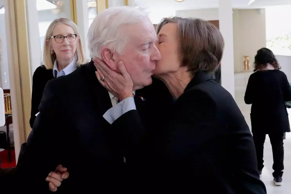 FILE - North Carolina Lt. Gov. Rachel Hunt, right, kisses her father, former North Carolina Gov. Jim Hunt, left, after she presided over the Senate session at the Legislative Building, Jan. 8, 2025, in Raleigh, N.C. (AP Photo/Chris Seward, File)