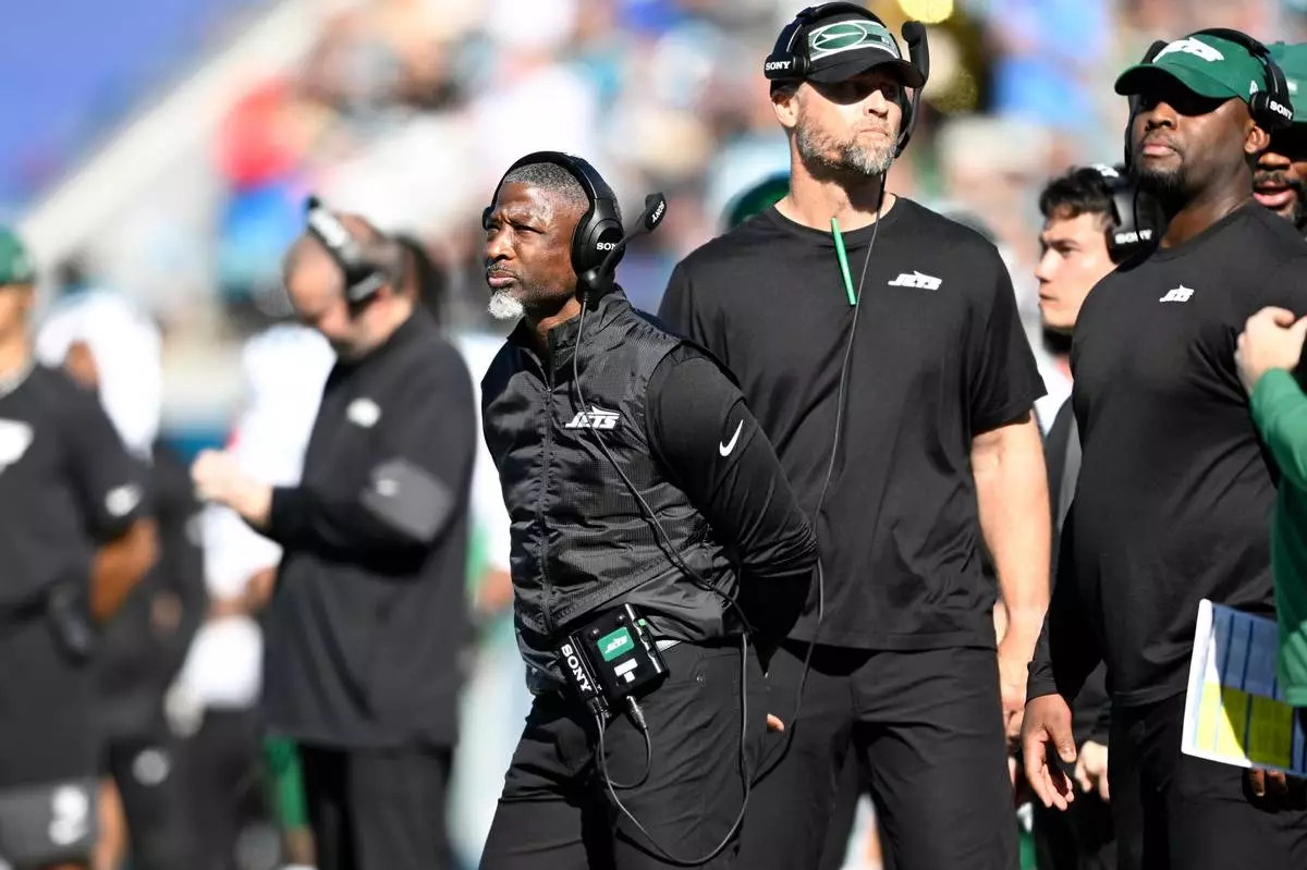 New York Jets head coach Aaron Glenn looks on during the first half against the Jacksonville Jaguars in an NFL football game, Sunday, Dec. 14, 2025, in Jacksonville, Fla. (AP Photo/Phelan M. Ebenhack)
