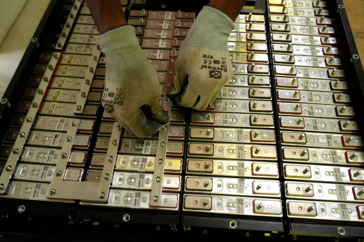 FILE - A battery production engineer at Nunam assembles a refurbished battery pack, made from used electric vehicle batteries, at their facility in Bengaluru, India, Oct. 8, 2024. (AP Photo/Aijaz Rahi, File)