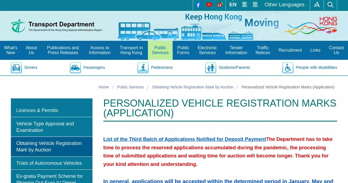 (c) Through the online application service on the GovHK website (www.gov.hk/en/residents/transport/vehicle/ospvrm.htm) if the applicant possesses an "iAM Smart+" account with the digital signing function (for Hong Kong residents only) or a digital certificate.