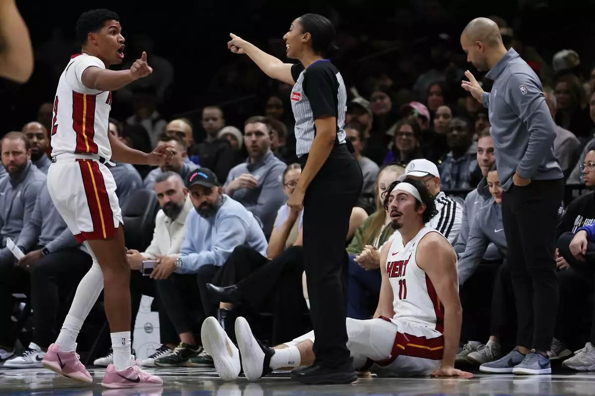 Miami Heat forward Jaime Jaquez Jr. (11) watches after falling as teammate Dru Smith argues with an official during the first half of an NBA basketball game, Thursday, Dec. 18, 2025, in New York. (AP Photo/Heather Khalifa)