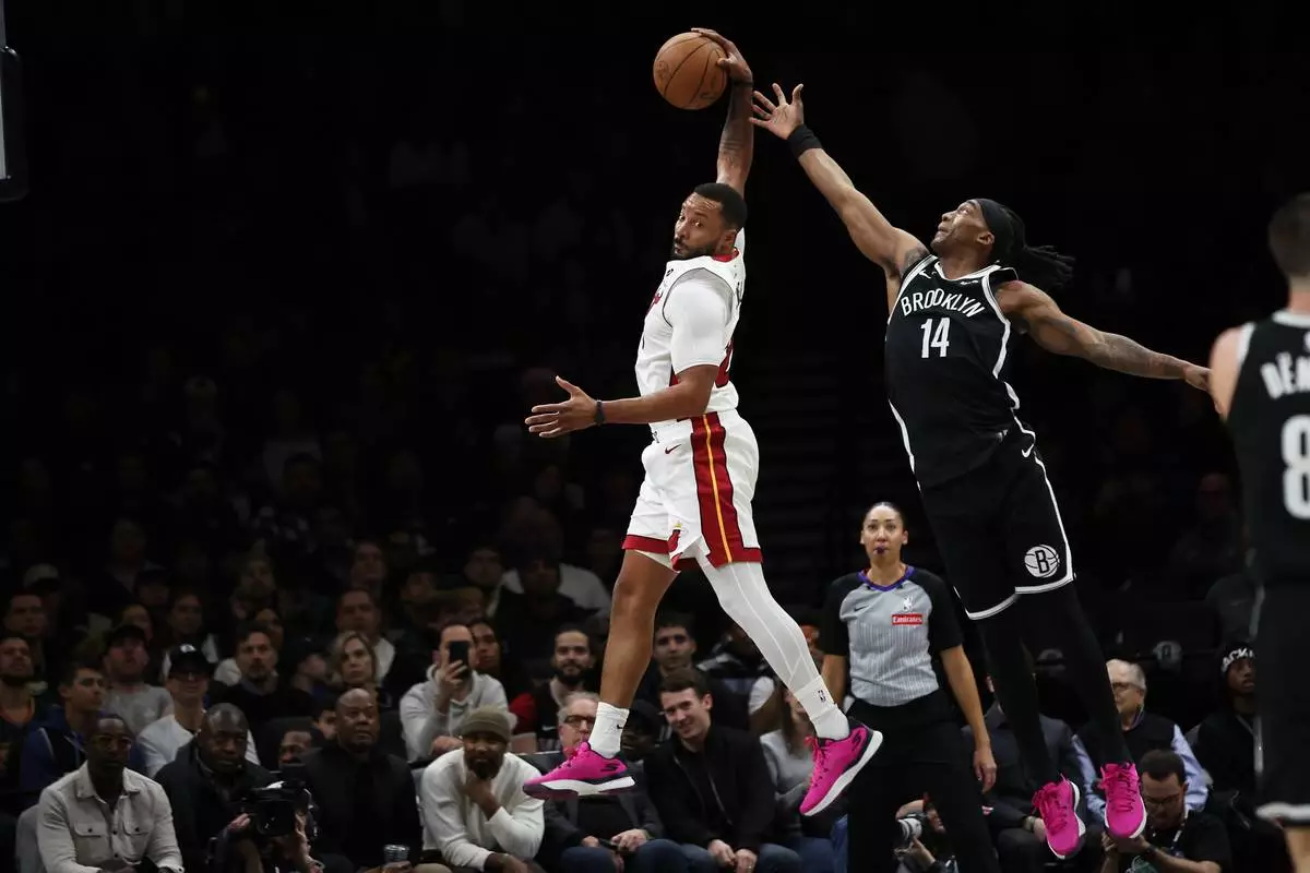 Miami Heat guard Norman Powell, left, grabs a rebound over Brooklyn Nets guard Terance Mann (14) during the first half of an NBA basketball game, Thursday, Dec. 18, 2025, in New York. (AP Photo/Heather Khalifa)