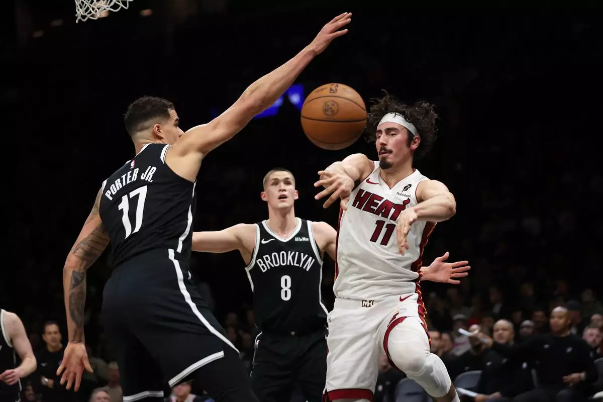 Miami Heat forward Jaime Jaquez Jr. (11) passes the ball around Brooklyn Nets forward Michael Porter Jr. (17) during the first half of an NBA basketball game, Thursday, Dec. 18, 2025, in New York. (AP Photo/Heather Khalifa)