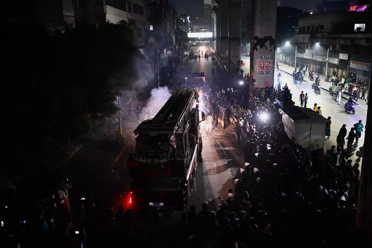 A fire engine arrives at the premises of The Daily Star newspaper after angry protesters set it on fire after news reached the country from Singapore of the death of a prominent activist Sharif Osman Hadi, in Dhaka, Bangladesh, Friday, Dec. 19, 2025. (AP Photo/Mahmud Hossain Opu)
