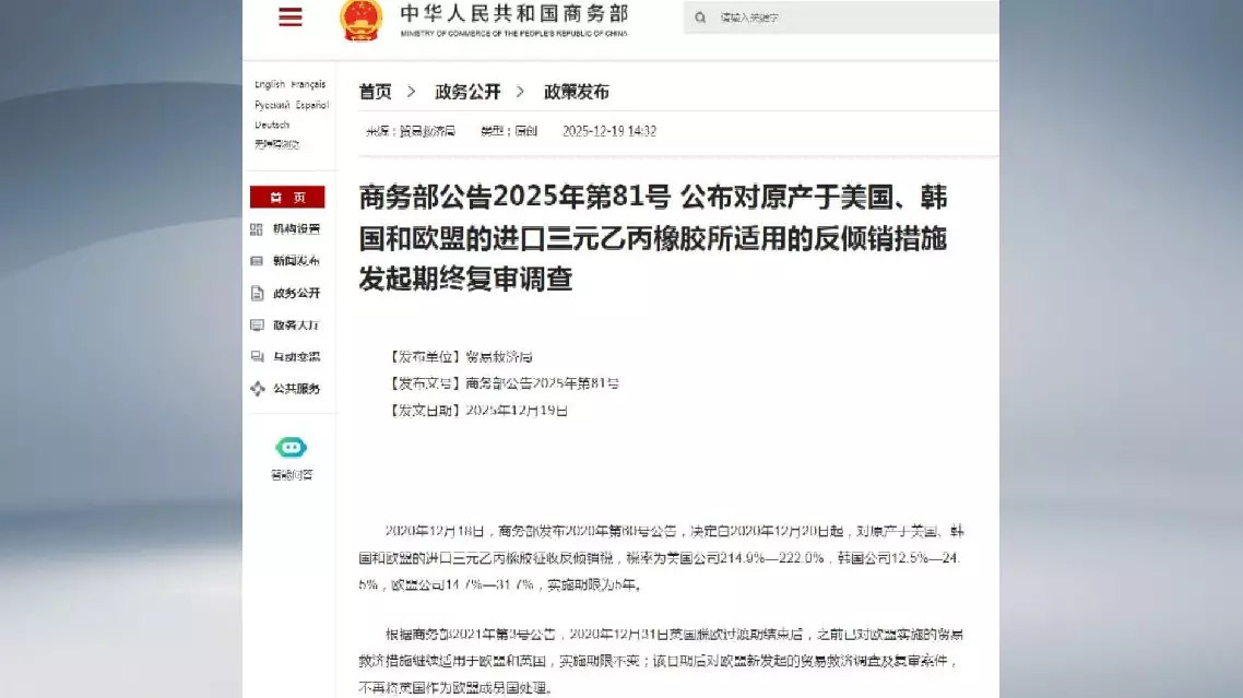 China will maintain anti-dumping duties on ethylene propylene diene monomer (EPDM) imports from the United States, South Korea and the European Union (EU) during the one-year process of expiry review of the anti-dumping measures in place since 2020, the Ministry of Commerce announced on Friday.