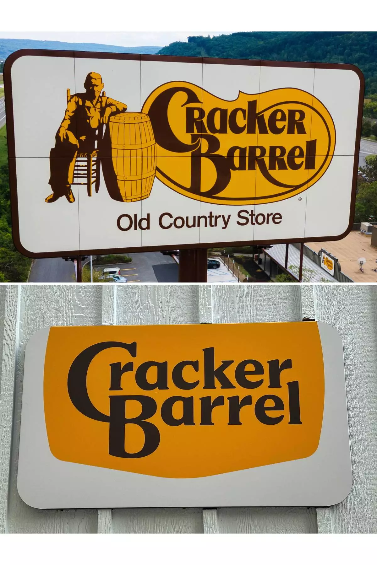 This combination of images shows the original a Cracker Barrel restaurant logo at a restaurant in Binghamton, N.Y., on Aug. 23, 2025, top, and the new Cracker Barrel logo displayed in New York on Aug. 21, 2025. (AP Photo)