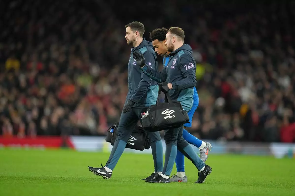 Bournemouth's Tyler Adams is helped off the pitch during a Premier League soccer match between Manchester United and Bournemouth in Manchester, England, Monday, Dec. 15, 2025. (AP Photo/Jon Super)