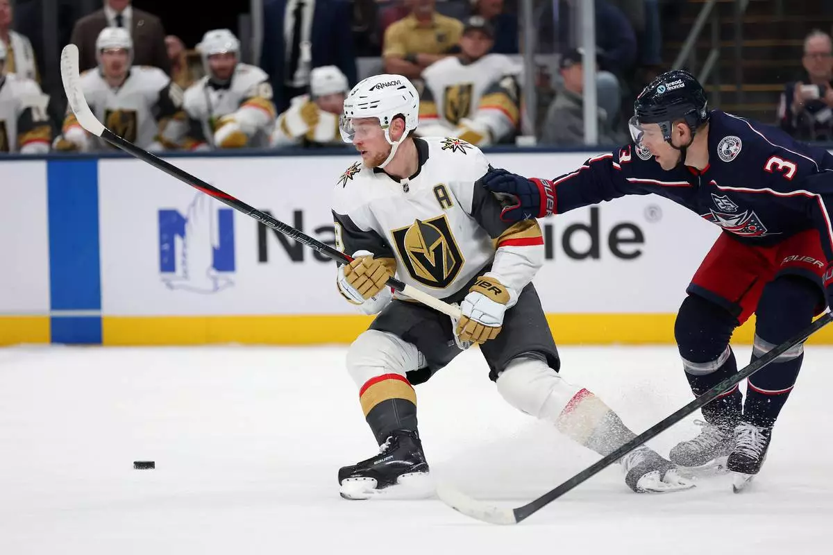 Vegas Golden Knights center Jack Eichel (9) loses the puck as Columbus Blue Jackets center Charlie Coyle (3) defends on the play during the second period of an NHL hockey game Saturday, Dec. 13, 2025, in Columbus, Ohio. (AP Photo/Joe Maiorana)