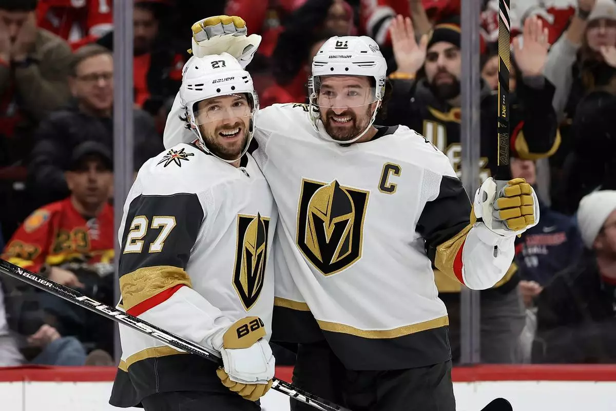Vegas Golden Knights defenseman Shea Theodore (27) is congratulated after scoring a goal by Mark Stone, right, during the first period of an NHL hockey game against the New Jersey Devils, Friday, Dec. 5, 2025, in Newark, N.J. (AP Photo/Adam Hunger)