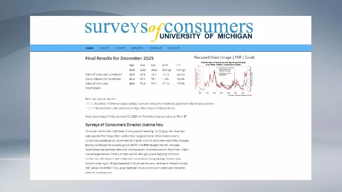 The U.S. Consumer Sentiment Index released Friday by the University of Michigan (UM) Surveys of Consumers rose to 52.9 in the December 2025 survey, up from 51 in November but below last December's 74.