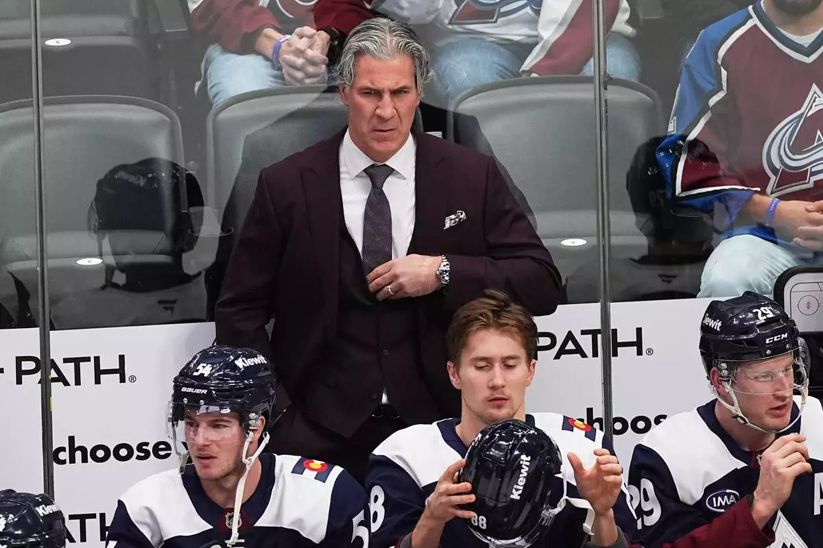 Colorado Avalanche head coach Jared Bednar, top, looks on from the team box in the first period of an NHL hockey game against the Winnipeg Jets, Friday, Dec. 19, 2025, in Denver. (AP Photo/David Zalubowski)