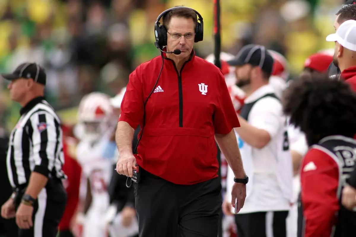 FILE - Indiana head coach Curt Cignetti walks the sidelines during the second half of an NCAA college football game against Oregon, Saturday, Oct. 11, 2025, in Eugene, Ore. (AP Photo/Lydia Ely, File)