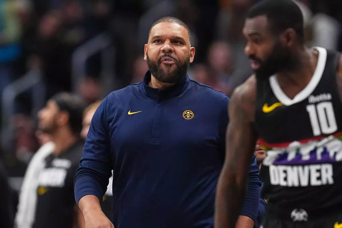 Denver Nuggets assistant coach Jared Dudley looks on from the bench after taking over the team when head coach David Adelman was ejected in the second half of an NBA basketball game against the Houston Rockets, Saturday, Dec. 20, 2025, in Denver. (AP Photo/David Zalubowski)
