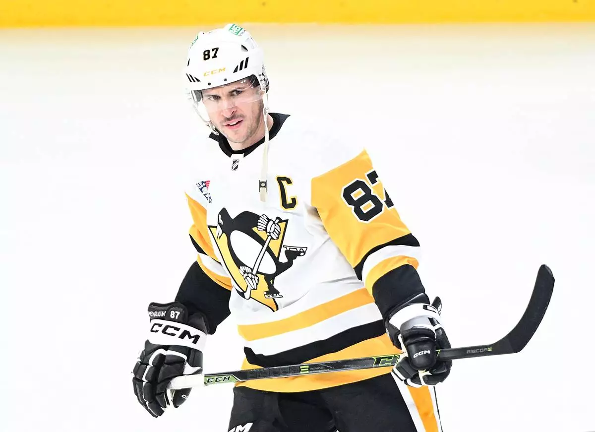 Pittsburgh Penguins' Sidney Crosby skates prior to an NHL hockey game against the Montreal Canadiens in Montreal, Saturday, Dec. 20, 2025. (Graham Hughes/The Canadian Press via AP)