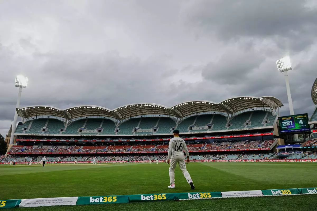 Australia's Jake Weatherald fields near the boundary during play on the final day of the third Ashes cricket test between England and Australia in Adelaide, Australia, Sunday, Dec. 21, 2025. (AP Photo/James Elsby)