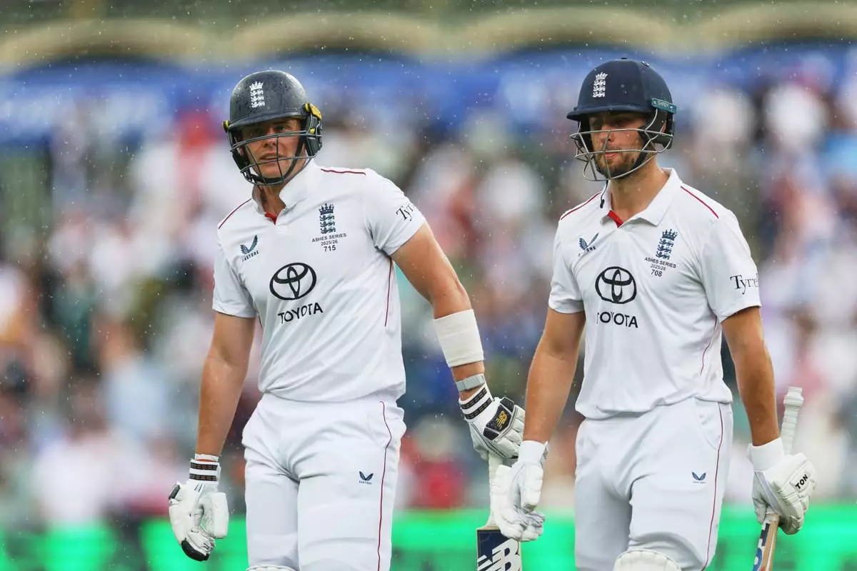 England's Jamie Smith, left, and Will Jacks walk from the field as rain delays play on the final day of the third Ashes cricket test between England and Australia in Adelaide, Australia, Sunday, Dec. 21, 2025. (AP Photo/James Elsby)