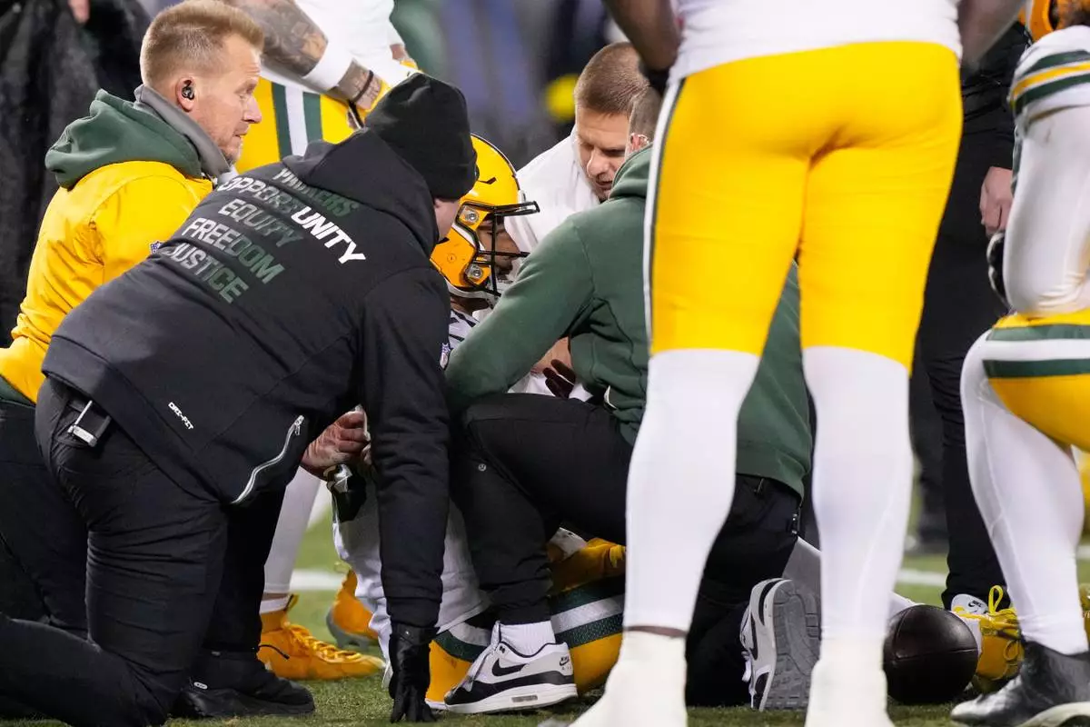 Green Bay Packers' Jordan Love is attended to after being hurt during the first half of an NFL football game against the Chicago Bears Saturday, Dec. 20, 2025, in Chicago. (AP Photo/Nam Huh)