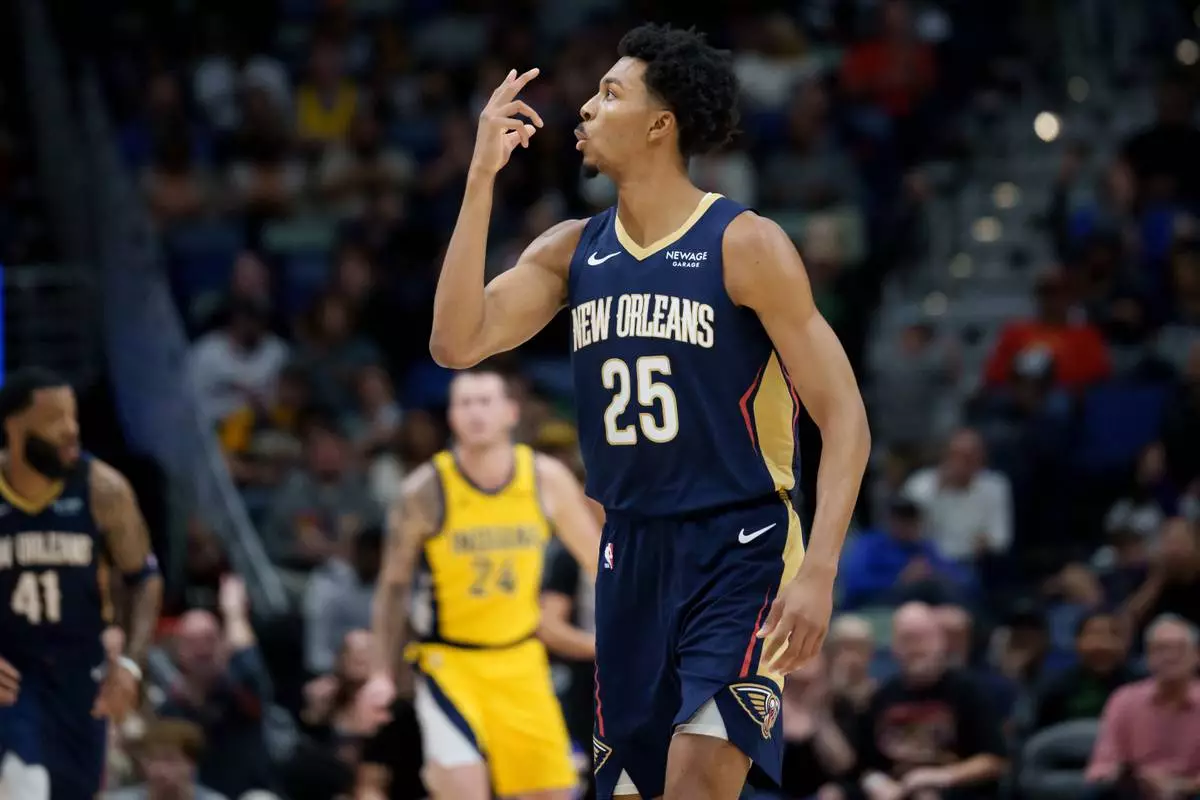 New Orleans Pelicans forward Trey Murphy III (25) reacts after making a basket against the Indiana Pacers during the first half of an NBA basketball game in New Orleans, Saturday, Dec. 20, 2025. (AP Photo/Matthew Hinton)