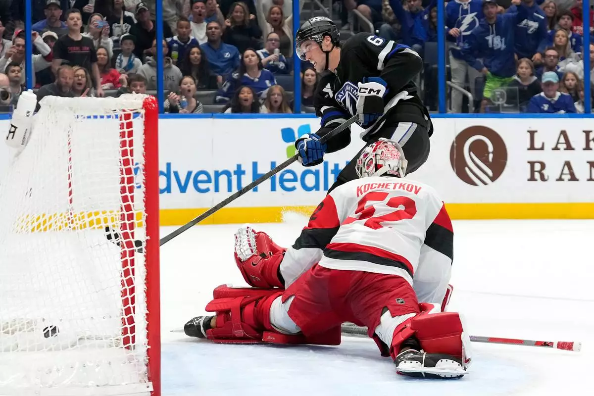 Tampa Bay Lightning center Brayden Point (21) watches his goal get past Carolina Hurricanes goaltender Pyotr Kochetkov (52) during the second period of an NHL hockey game Saturday, Dec. 20, 2025, in Tampa, Fla. (AP Photo/Chris O'Meara)