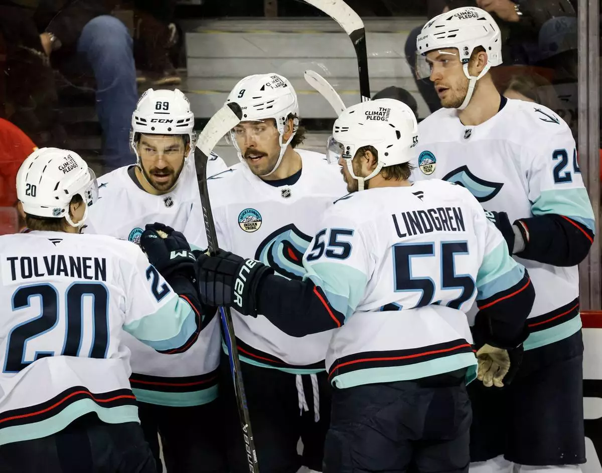 Seattle Kraken's Chandler Stephenson, centre, celebrates his goal with teammates during the second period of an NHL hockey game against the Calgary Flames, in Calgary, Alberta, Thursday, Dec. 18, 2025. (Jeff McIntosh/The Canadian Press via AP)