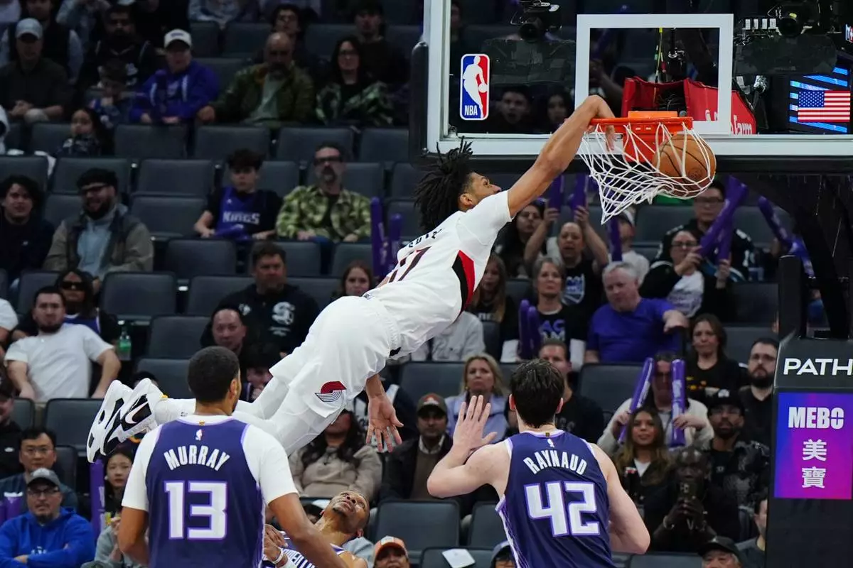 Portland Trail Blazers guard Shaedon Sharpe (17) dunks the ball during the second half of an NBA basketball game against the Sacramento Kings, Saturday, Dec. 20, 2025, in Sacramento, Calif. (AP Photo/Alan Greth)