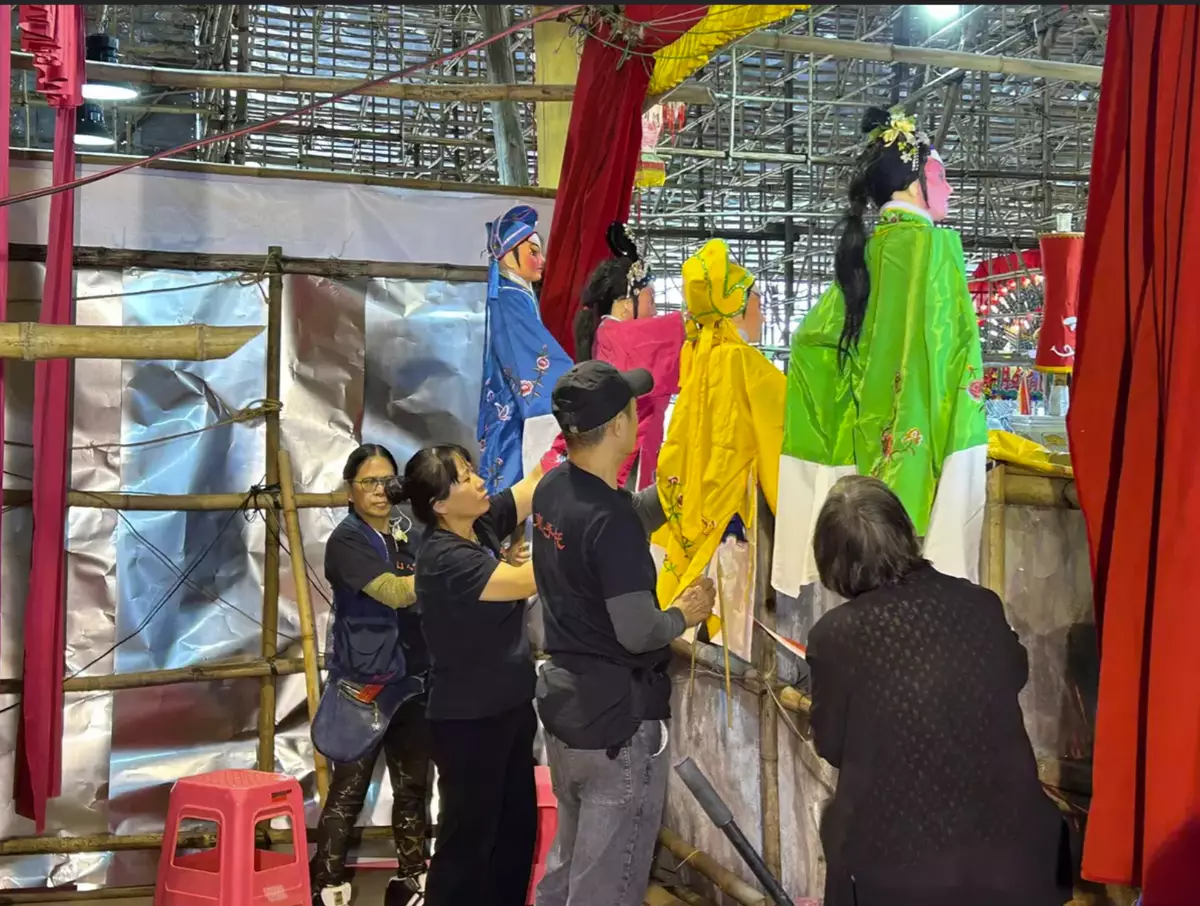 At the site of the Kam Tin Ten-Yearly Thanksgiving Festival, a group of "actors and actresses" dressed in splendid costumes are making gestures and moving nimbly to portray the joys and sorrows of the protagonists in the play. If you step closer, you will find the actors on the stage are not real people, but hand puppets instead. Behind the stage of this impressive performance is the only remaining hand puppet Cantonese opera troupe in Hong Kong - "Waa Saan Traditional Puppet Cantonese Opera Troupe".