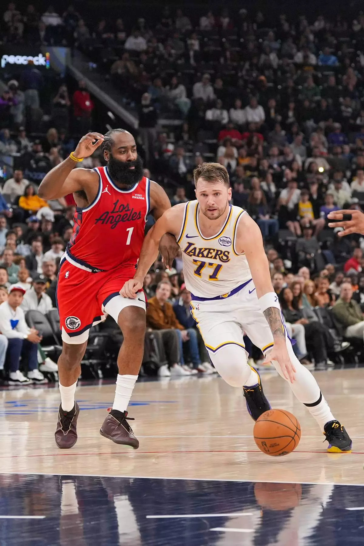 Los Angeles Clippers guard James Harden (1) pressures Los Angeles Lakers forward/guard Luka Doncic (77) during the first half of an NBA basketball game Saturday, Dec. 20, 2025, in Inglewood, Calif. (AP Photo/Jae C. Hong)