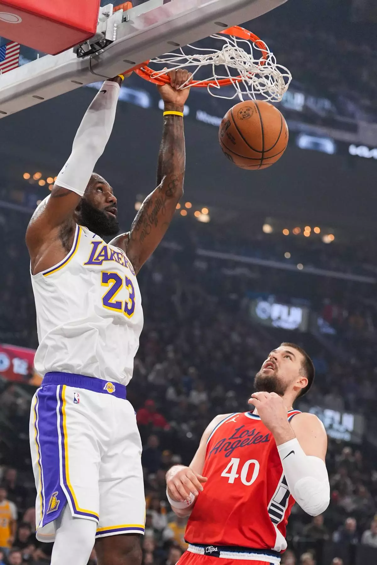 Los Angeles Lakers forward Lebron James (23) dunks as Los Angeles Clippers center Ivica Zubac (40) looks on during the first half of an NBA basketball game Saturday, Dec. 20, 2025, in Inglewood, Calif. (AP Photo/Jae C. Hong)