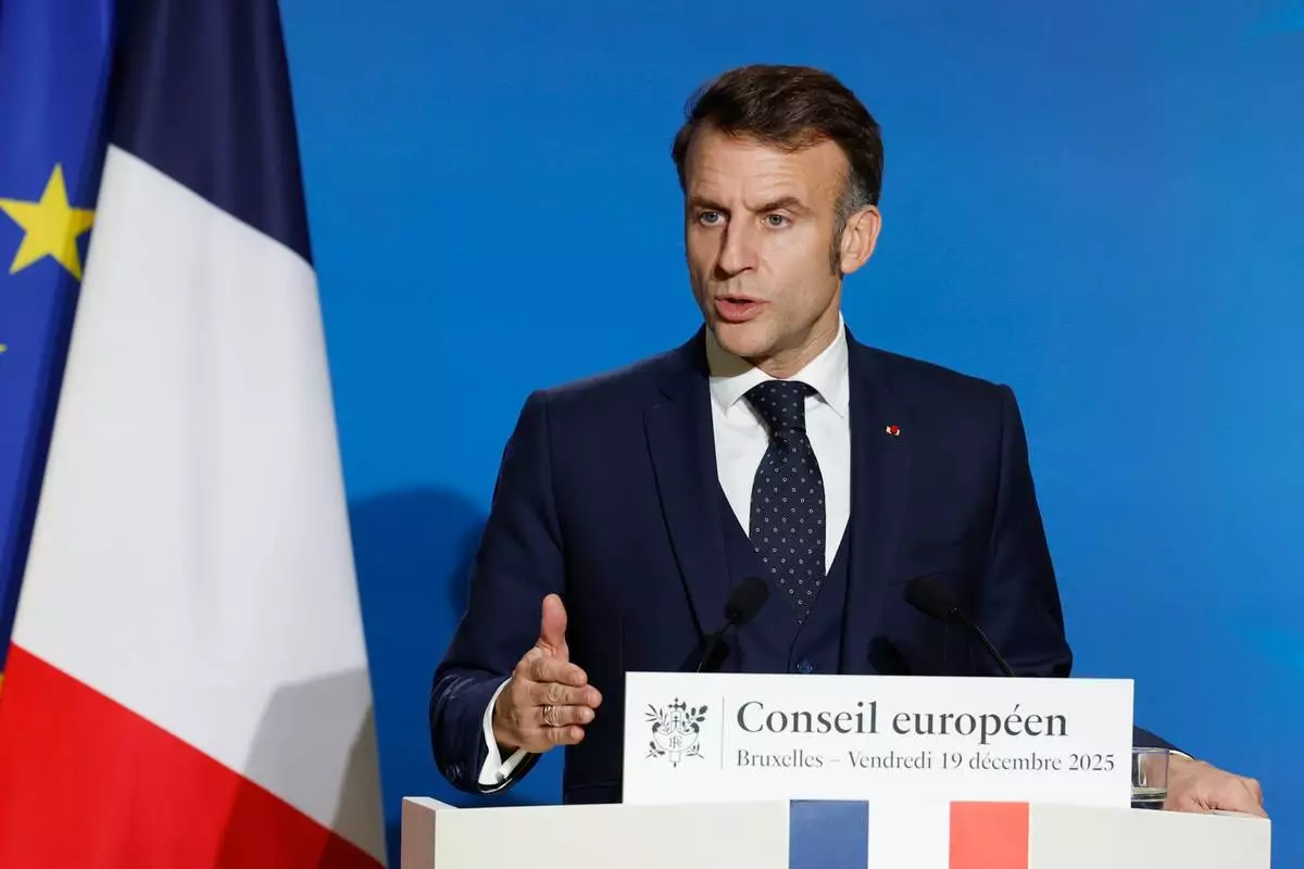 French President Emmanuel Macron speaks during a media conference at the EU Summit in Brussels, Friday, Dec. 19, 2025. (AP Photo/Geert Vanden Wijngaert)