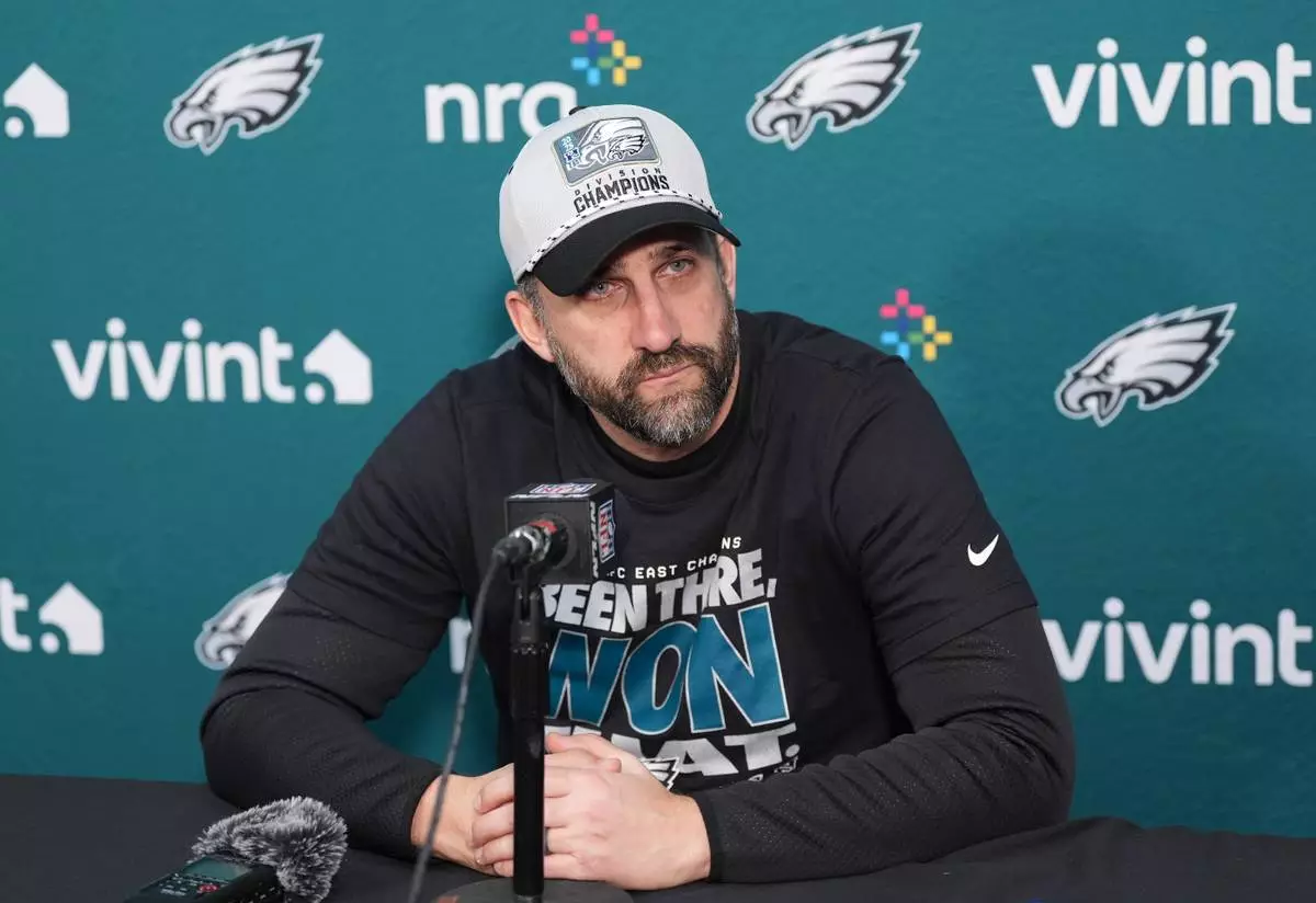 Philadelphia Eagles head coach Nick Sirianni talks to the media during a news conference following an NFL football game against the Washington Commanders, Saturday, Dec. 20, 2025, in Landover, Md. (AP Photo/Stephanie Scarbrough)